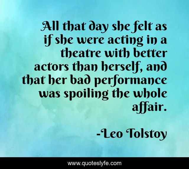 This page presents the quote "All that day she felt as if she were acting in a theatre with better actors than herself, and that her bad performance was spoiling the whole affair.". Author of this quote is Leo Tolstoy. This quote is about out-of-place, honesty, facades, inferiority,.