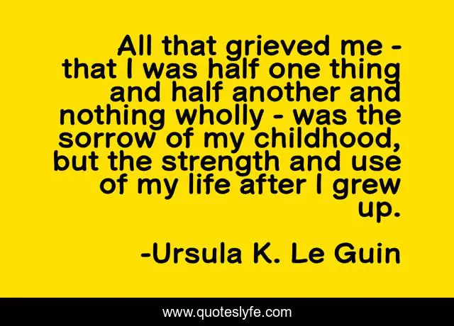 This page presents the quote "All that grieved me - that I was half one thing and half another and nothing wholly - was the sorrow of my childhood, but the strength and use of my life after I grew up.". Author of this quote is Ursula K. Le Guin. This quote is about grief, ursula-k-le-guin, growth,.