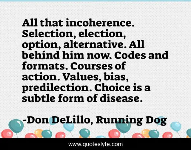 This page presents the quote "All that incoherence. Selection, election, option, alternative. All behind him now. Codes and formats. Courses of action. Values, bias, predilection. Choice is a subtle form of disease.". Author of this quote is Don DeLillo, Running Dog. .