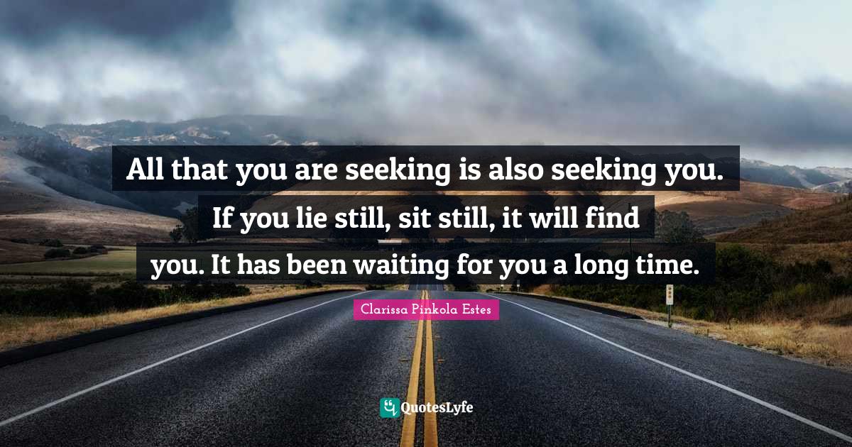 This page presents the quote "All that you are seeking is also seeking you. If you lie still, sit still, it will find you. It has been waiting for you a long time.". Author of this quote is Clarissa Pinkola Estes. This quote is about long time, long, seeking, lying, waiting for you, waiting,.