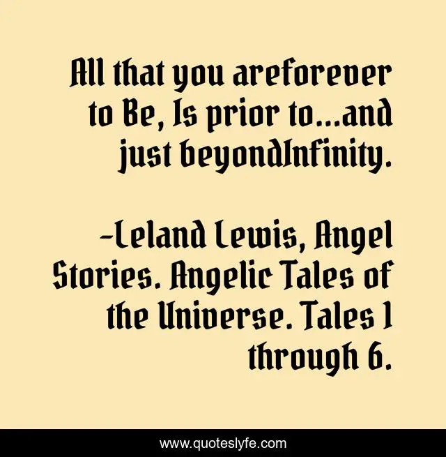 This page presents the quote "All that you areforever to Be, Is prior to...and just beyondInfinity.". Author of this quote is Leland Lewis, Angel Stories. Angelic Tales of the Universe. Tales 1 through 6.. This quote is about infinity, angels, angelic,.