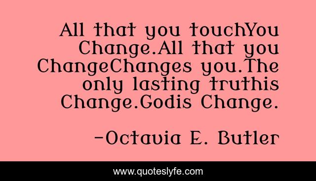 This page presents the quote "All that you touchYou Change.All that you ChangeChanges you.The only lasting truthis Change.Godis Change.". Author of this quote is Octavia E. Butler. This quote is about god, change,.