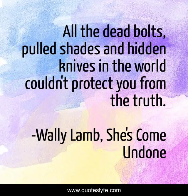 This page presents the quote "All the dead bolts, pulled shades and hidden knives in the world couldn't protect you from the truth.". Author of this quote is Wally Lamb, She's Come Undone. This quote is about strength, honesty, coping, inspirational, lies, truth, enthusiasm,.