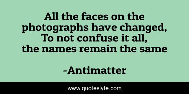 This page presents the quote "All the faces on the photographs have changed, To not confuse it all, the names remain the same". Author of this quote is Antimatter. This quote is about lyrics, missing, friends, past, music, home, changes,.