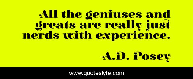 This page presents the quote "All the geniuses and greats are really just nerds with experience.". Author of this quote is A.D. Posey. This quote is about greats, storytelling, storytellers, experience, writing, write, writers, ad-posey, inspirational,.
