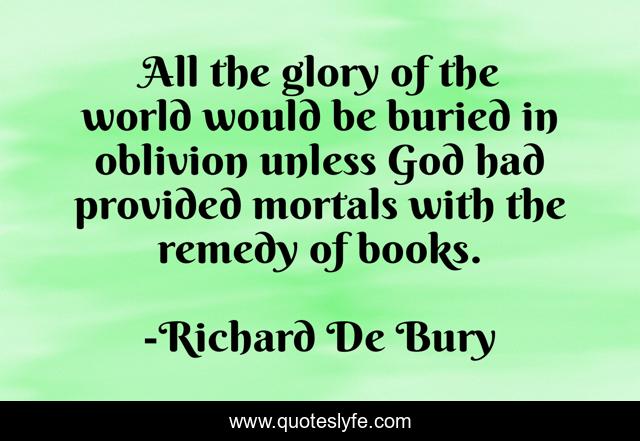 This page presents the quote "All the glory of the world would be buried in oblivion unless God had provided mortals with the remedy of books.". Author of this quote is Richard De Bury. This quote is about books, reading,.