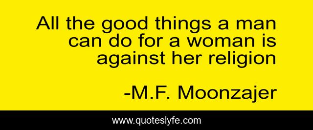 This page presents the quote "All the good things a man can do for a woman is against her religion". Author of this quote is M.F. Moonzajer. This quote is about religion, woman, man, things,.