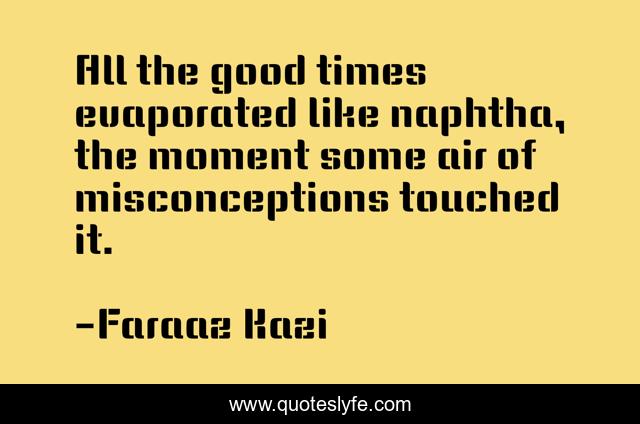 This page presents the quote "All the good times evaporated like naphtha, the moment some air of misconceptions touched it.". Author of this quote is Faraaz Kazi. This quote is about misconceptions, trust, misunderstandings,.