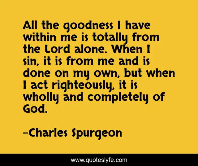 This page presents the quote "All the goodness I have within me is totally from the Lord alone. When I sin, it is from me and is done on my own, but when I act righteously, it is wholly and completely of God.". Author of this quote is Charles Spurgeon. This quote is about me, god, sin,.