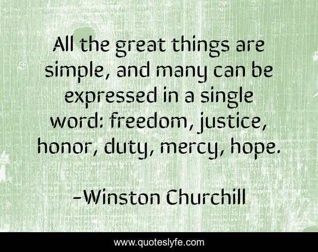 This page presents the quote "All the great things are simple, and many can be expressed in a single word: freedom, justice, honor, duty, mercy, hope.". Author of this quote is Winston Churchill. This quote is about justice, freedom, great,.