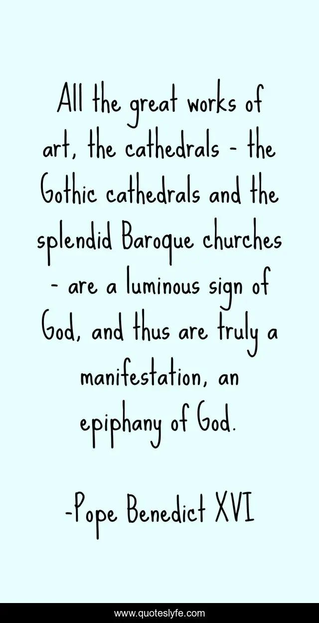 This page presents the quote "All the great works of art, the cathedrals - the Gothic cathedrals and the splendid Baroque churches - are a luminous sign of God, and thus are truly a manifestation, an epiphany of God.". Author of this quote is Pope Benedict XVI. This quote is about god, great, sign,.