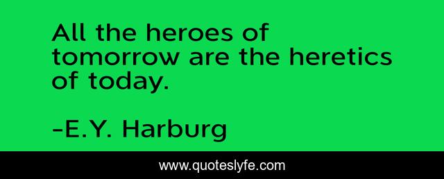 This page presents the quote "All the heroes of tomorrow are the heretics of today.". Author of this quote is E.Y. Harburg. This quote is about heretics, heroes, conformity,.
