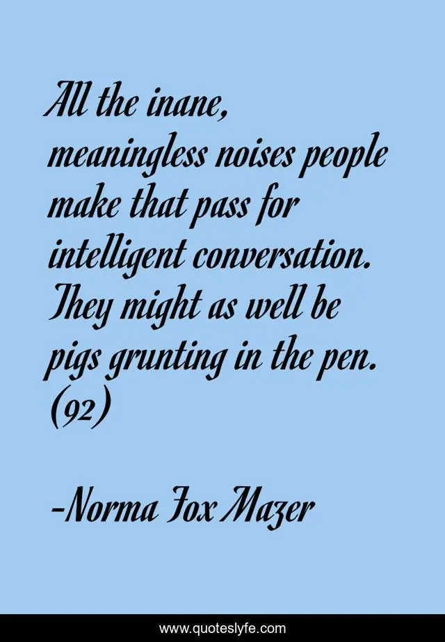 This page presents the quote "All the inane, meaningless noises people make that pass for intelligent conversation. They might as well be pigs grunting in the pen. (92)". Author of this quote is Norma Fox Mazer. This quote is about conversation, stupidity, pigs,.
