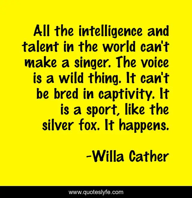 This page presents the quote "All the intelligence and talent in the world can't make a singer. The voice is a wild thing. It can't be bred in captivity. It is a sport, like the silver fox. It happens.". Author of this quote is Willa Cather. This quote is about world, voice, talent,.