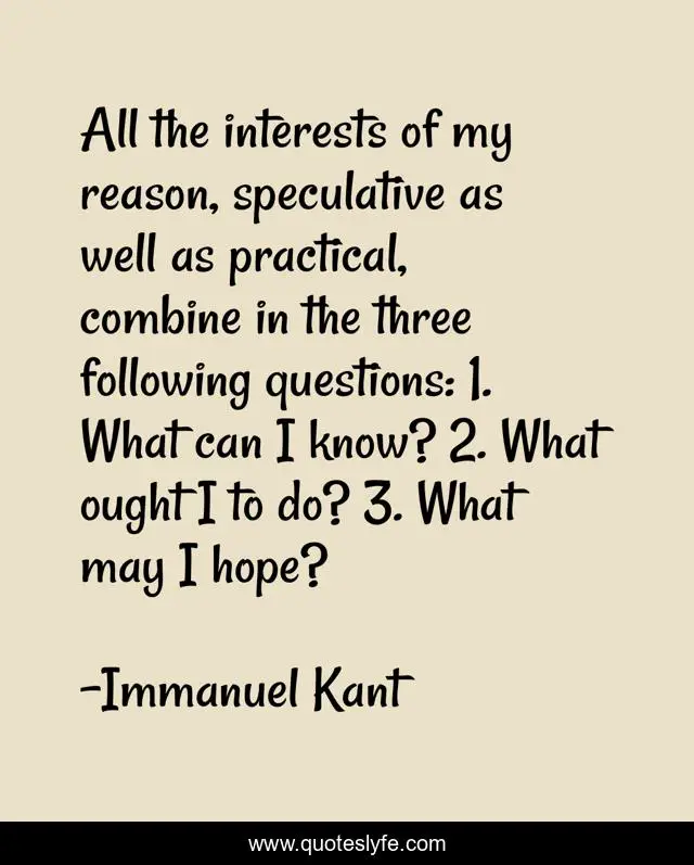 All the interests of my reason, speculative as well as practical, combine in the three following questions: 1. What can I know? 2. What ought I to do? 3. What may I hope?