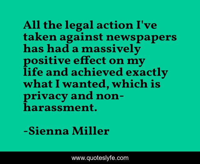 This page presents the quote "All the legal action I've taken against newspapers has had a massively positive effect on my life and achieved exactly what I wanted, which is privacy and non-harassment.". Author of this quote is Sienna Miller. This quote is about action, life, legal,.