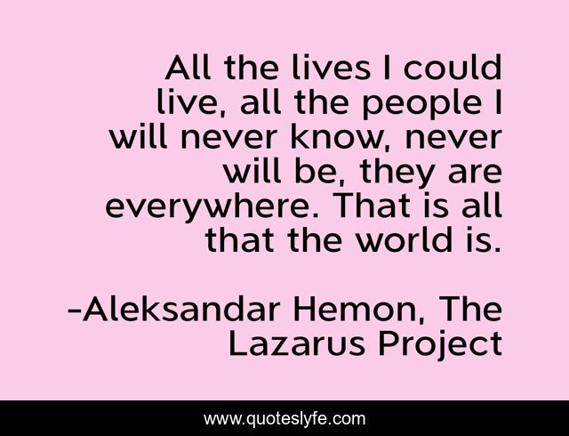 This page presents the quote "All the lives I could live, all the people I will never know, never will be, they are everywhere. That is all that the world is.". Author of this quote is Aleksandar Hemon, The Lazarus Project. .