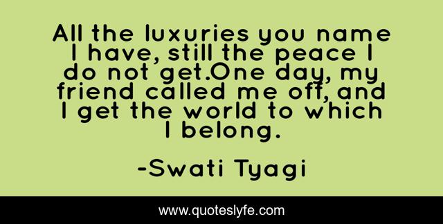 This page presents the quote "All the luxuries you name I have, still the peace I do not get.One day, my friend called me off, and I get the world to which I belong.". Author of this quote is Swati Tyagi. .