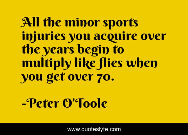 This page presents the quote "All the minor sports injuries you acquire over the years begin to multiply like flies when you get over 70.". Author of this quote is Peter O'Toole. This quote is about injuries, years,.