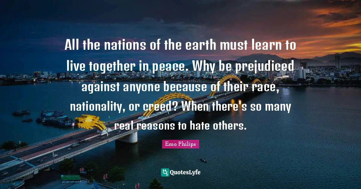 This page presents the quote "All the nations of the earth must learn to live together in peace. Why be prejudiced against anyone because of their race, nationality, or creed? When there's so many real reasons to hate others.". Author of this quote is Emo Philips. This quote is about peace, earth, race, together, nations, nationality, real, hate,.