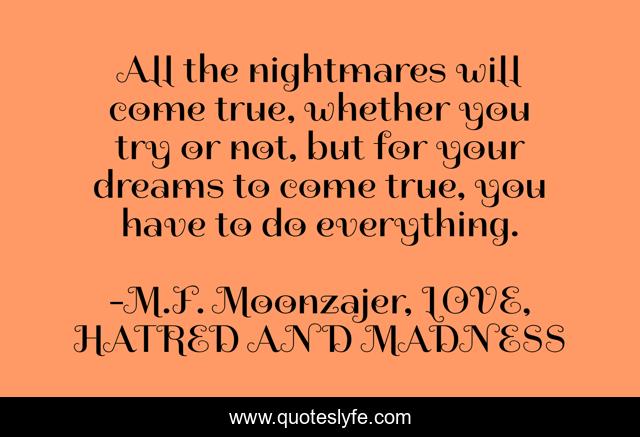 "M.F. Moonzajer, LOVE, HATRED AND MADNESS Quotes." Quoteslyfe.com, 2025. Tue. 09 Dec. 2025. <https://www.quoteslyfe.com/quote/All-the-nightmares-will-come-true-whether-221270>.