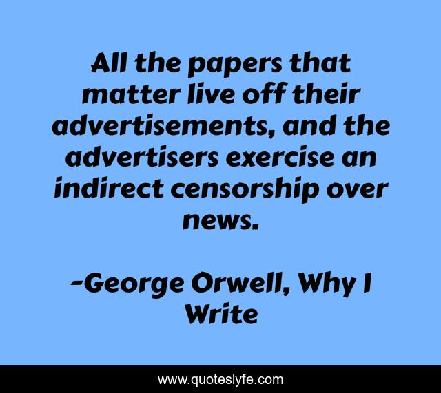 This page presents the quote "All the papers that matter live off their advertisements, and the advertisers exercise an indirect censorship over news.". Author of this quote is George Orwell, Why I Write. This quote is about truth, media, ideas, george-orwell, advertising, censorship, news,.