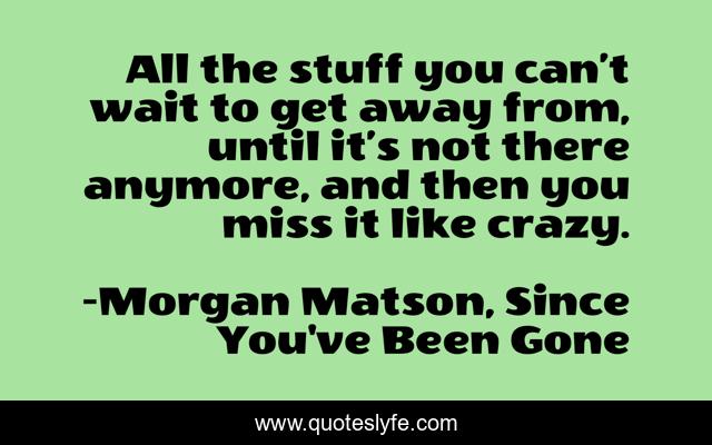 This page presents the quote "All the stuff you can’t wait to get away from, until it’s not there anymore, and then you miss it like crazy.". Author of this quote is Morgan Matson, Since You've Been Gone. .