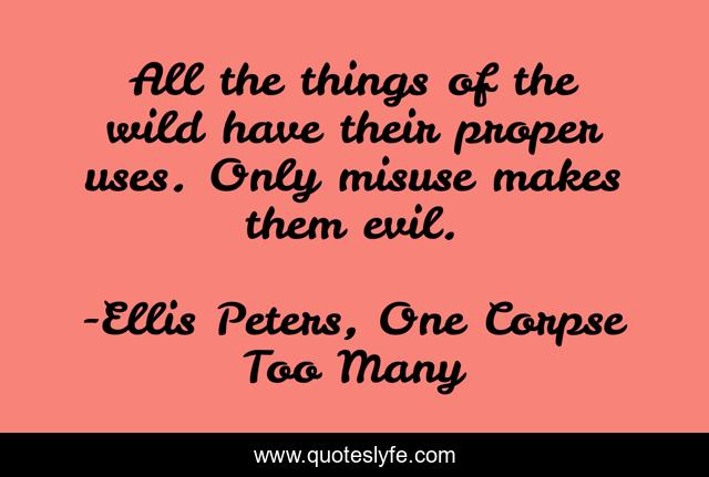 This page presents the quote "All the things of the wild have their proper uses. Only misuse makes them evil.". Author of this quote is Ellis Peters, One Corpse Too Many. This quote is about right-and-wrong, good-and-evil, corruption,.