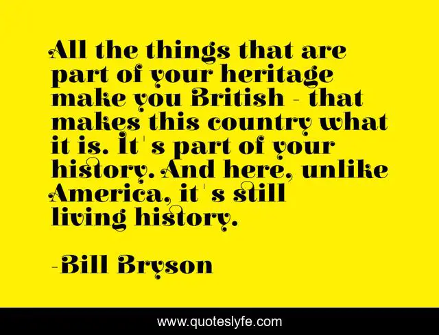 This page presents the quote "All the things that are part of your heritage make you British - that makes this country what it is. It's part of your history. And here, unlike America, it's still living history.". Author of this quote is Bill Bryson. This quote is about living, america,.