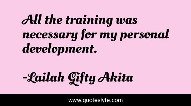 This page presents the quote "All the training was necessary for my personal development.". Author of this quote is Lailah Gifty Akita. This quote is about personal-responsibility, working-together, training, personal-growth, personal, work, lean, working-with-people, learning-process,.