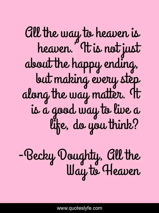 This page presents the quote "All the way to heaven is heaven.’ It is not just about the happy ending, but making every step along the way matter. It is a good way to live a life, do you think?". Author of this quote is Becky Doughty, All the Way to Heaven. This quote is about heaven, happy-endings, good-life, life-s-journey,.