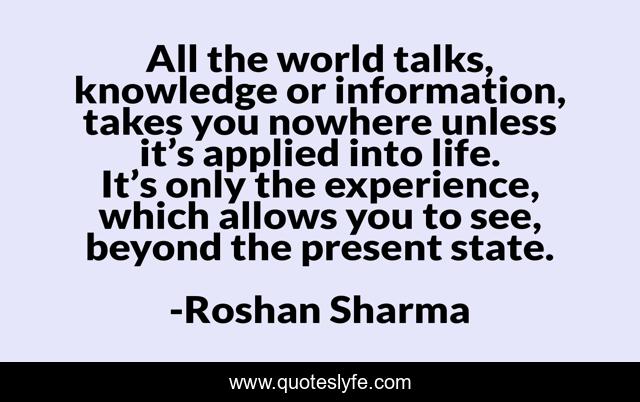 This page presents the quote "All the world talks, knowledge or information, takes you nowhere unless it’s applied into life. It’s only the experience, which allows you to see, beyond the present state.". Author of this quote is Roshan Sharma. This quote is about ambitions, secrets, god, passion, inspirational, enthusiasm, dreams,.