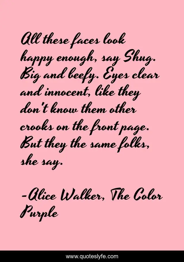 "Alice Walker, The Color Purple Quotes." Quoteslyfe.com, 2025. Mon. 08 Dec. 2025. <https://www.quoteslyfe.com/quote/All-these-faces-look-happy-enough-say-244456>.