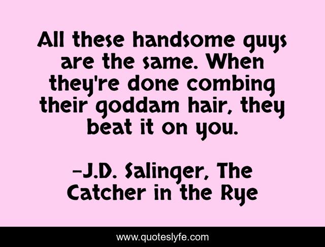 This page presents the quote "All these handsome guys are the same. When they're done combing their goddam hair, they beat it on you.". Author of this quote is J.D. Salinger, The Catcher in the Rye. .