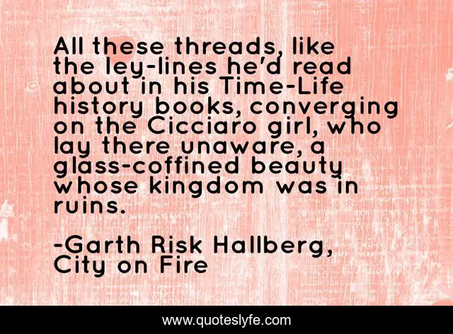 This page presents the quote "All these threads, like the ley-lines he'd read about in his Time-Life history books, converging on the Cicciaro girl, who lay there unaware, a glass-coffined beauty whose kingdom was in ruins.". Author of this quote is Garth Risk Hallberg, City on Fire. This quote is about converging, city-on-fire, garth-risk-hallberg, sleeping-beauty, fairy-tales, interconnectedness, snow-white,.