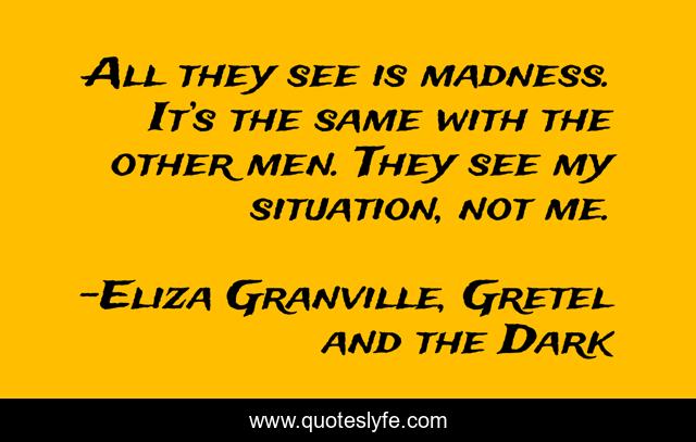 This page presents the quote "All they see is madness. It’s the same with the other men. They see my situation, not me.". Author of this quote is Eliza Granville, Gretel and the Dark. .