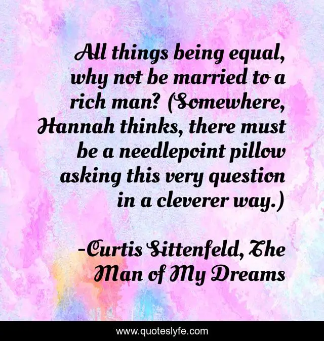 This page presents the quote "All things being equal, why not be married to a rich man? (Somewhere, Hannah thinks, there must be a needlepoint pillow asking this very question in a cleverer way.)". Author of this quote is Curtis Sittenfeld, The Man of My Dreams. This quote is about good-questions, marriage, riches,.