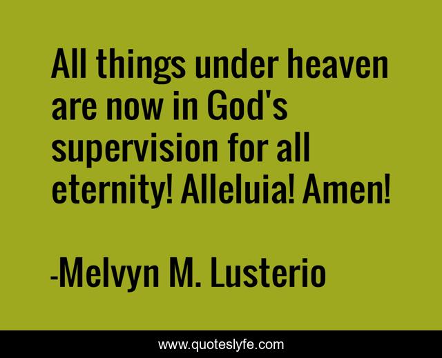 This page presents the quote "All things under heaven are now in God's supervision for all eternity! Alleluia! Amen!". Author of this quote is Melvyn M. Lusterio. This quote is about perfect, winner, wise, truth,.