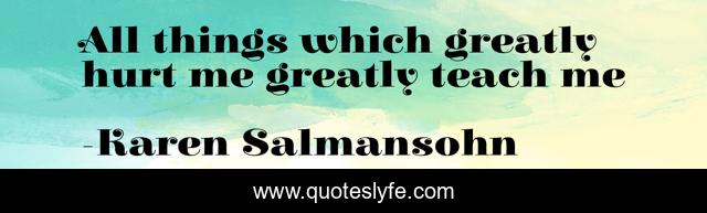 This page presents the quote "All things which greatly hurt me greatly teach me". Author of this quote is Karen Salmansohn. This quote is about tough-times, life-experience, moving-on, life-lessons, resilience,.
