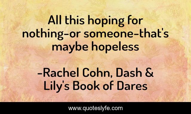 This page presents the quote "All this hoping for nothing-or someone-that's maybe hopeless". Author of this quote is Rachel Cohn, Dash & Lily's Book of Dares. This quote is about life, hope,.