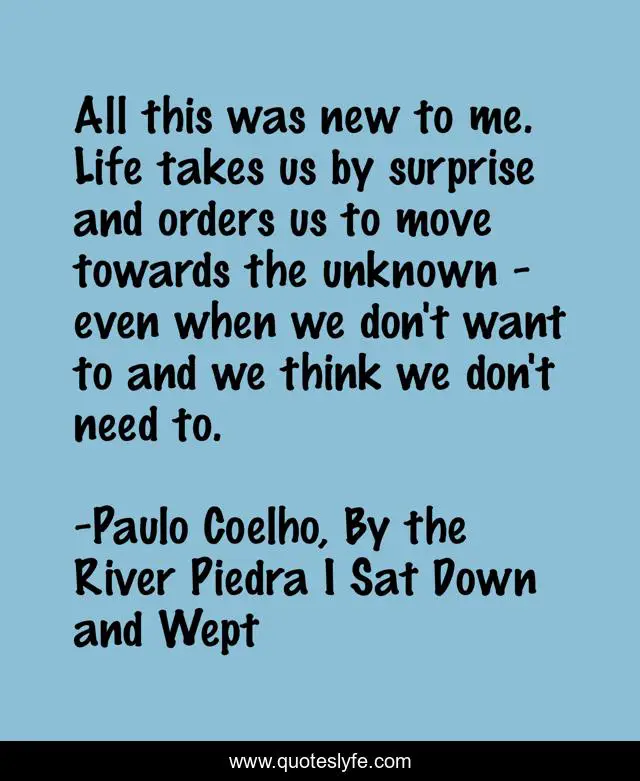 This page presents the quote "All this was new to me. Life takes us by surprise and orders us to move towards the unknown - even when we don't want to and we think we don't need to.". Author of this quote is Paulo Coelho, By the River Piedra I Sat Down and Wept. This quote is about surprises, life, fate,.