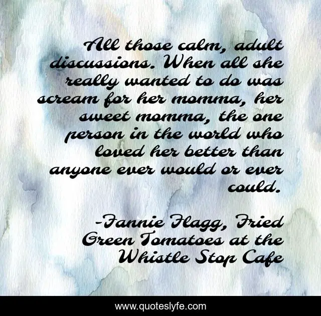 This page presents the quote "All those calm, adult discussions. When all she really wanted to do was scream for her momma, her sweet momma, the one person in the world who loved her better than anyone ever would or ever could.". Author of this quote is Fannie Flagg, Fried Green Tomatoes at the Whistle Stop Cafe. This quote is about death, mother-s-love, mother,.
