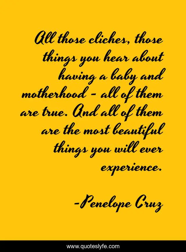This page presents the quote "All those cliches, those things you hear about having a baby and motherhood - all of them are true. And all of them are the most beautiful things you will ever experience.". Author of this quote is Penelope Cruz. This quote is about beautiful, baby, motherhood,.