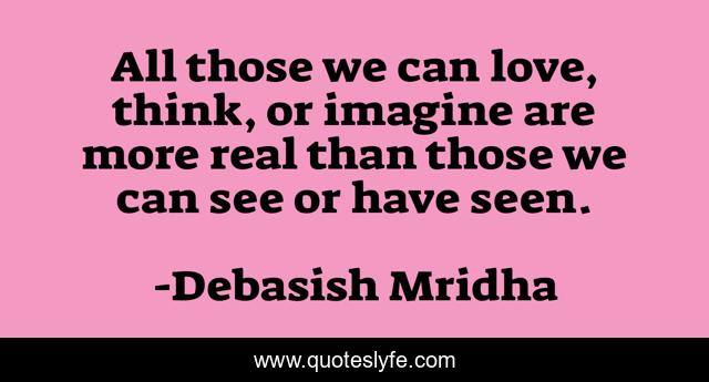 This page presents the quote "All those we can love, think, or imagine are more real than those we can see or have seen.". Author of this quote is Debasish Mridha. This quote is about love, who-is-real-to-us, philosophy, debasish-mridha, quotes, debasish-mridha-md, inspirational, imagine, enthusiasm,.