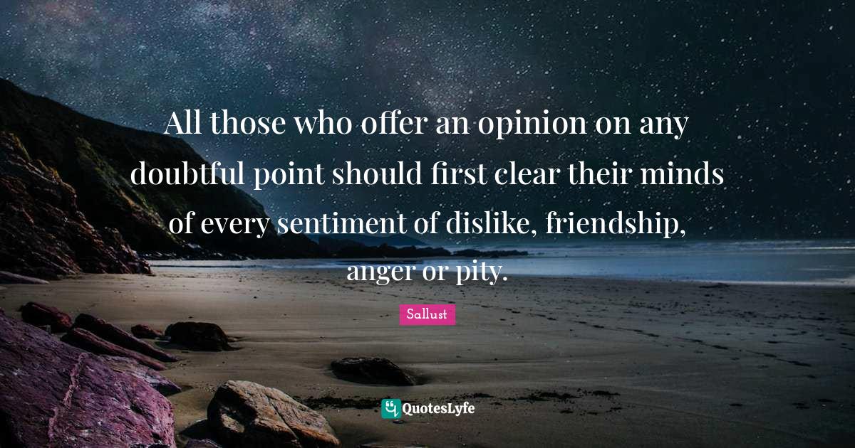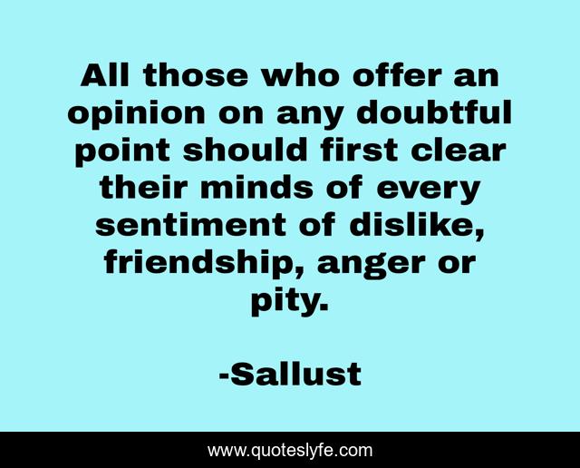 This page presents the quote "All those who offer an opinion on any doubtful point should first clear their minds of every sentiment of dislike, friendship, anger or pity.". Author of this quote is Sallust. This quote is about anger, opinion, first,.