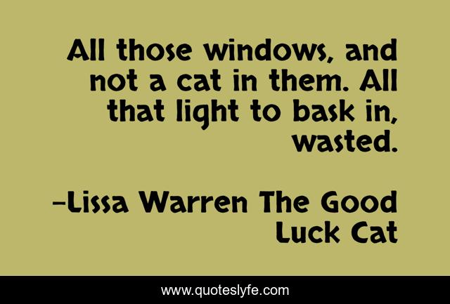 This page presents the quote "All those windows, and not a cat in them. All that light to bask in, wasted.". Author of this quote is Lissa Warren The Good Luck Cat. This quote is about cats, animals,.