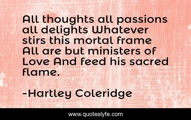 This page presents the quote "All thoughts all passions all delights Whatever stirs this mortal frame All are but ministers of Love And feed his sacred flame.". Author of this quote is Hartley Coleridge. This quote is about love, affection,.