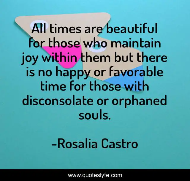 This page presents the quote "All times are beautiful for those who maintain joy within them but there is no happy or favorable time for those with disconsolate or orphaned souls.". Author of this quote is Rosalia Castro. .