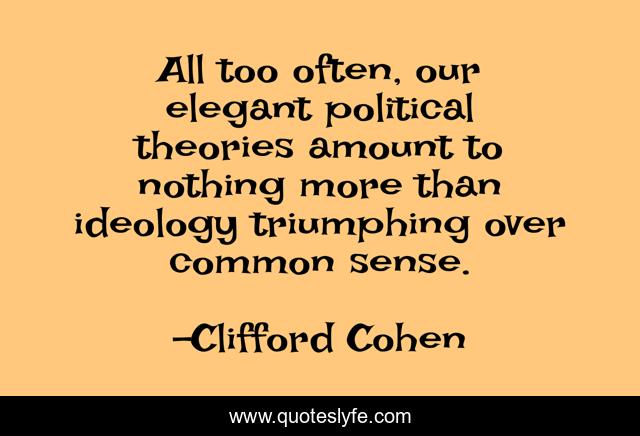 This page presents the quote "All too often, our elegant political theories amount to nothing more than ideology triumphing over common sense.". Author of this quote is Clifford Cohen. This quote is about political-platforms, social-policy, problem-solving, politics, common-sense, political-theory,.