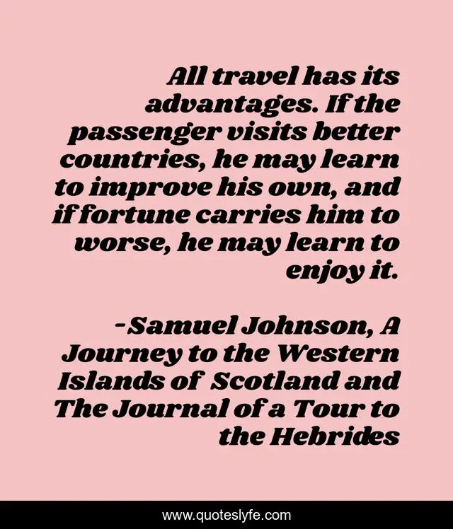 This page presents the quote "All travel has its advantages. If the passenger visits better countries, he may learn to improve his own, and if fortune carries him to worse, he may learn to enjoy it.". Author of this quote is Samuel Johnson, A Journey to the Western Islands of Scotland and The Journal of a Tour to the Hebrides. This quote is about travel, tip-of-thought,.